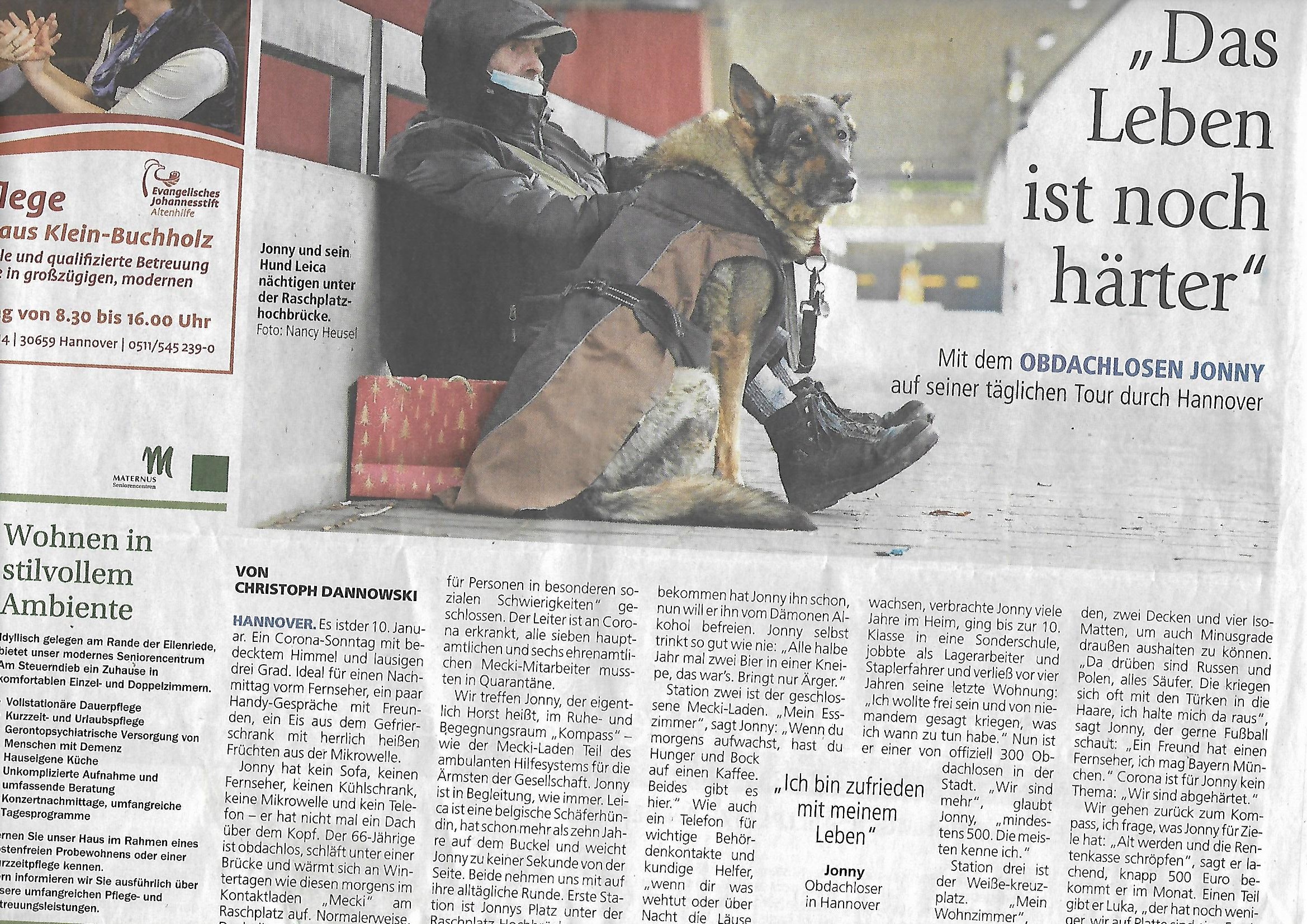 „Ich bin Tierschützerin und Taxifahrerin in Hannover. Seit rund einem Jahr versorge ich den wohnungslosen Jonny, Besitzer von Leyka, 2-3 Mal im Monat mit Lebensmitteln, sowie Hundefutter u.ä..