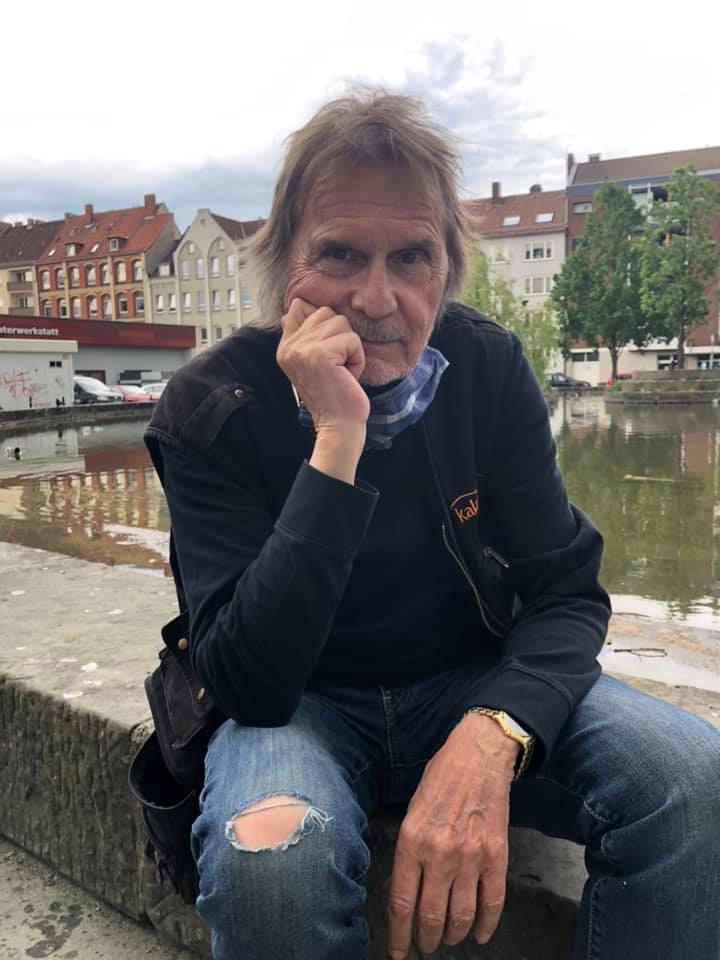 Gerichtet sind die Worte an Uli Stein, der bis zu diesem Moment noch nahezu unentdeckt auf der Steinmauer hinter dem Raschplatzpavillon sitzt. Kaffee trinkend ,  eine Zigarette rauchend und das ganze Drumherum beobachtend. Das hätte er wahrscheinlich auch liebend gern  fortgesetzt. Fast scheint er etwas genervt von dem Trubel. Doch letztlich hat er ihn  selbst angestiftet. Angestiftet: